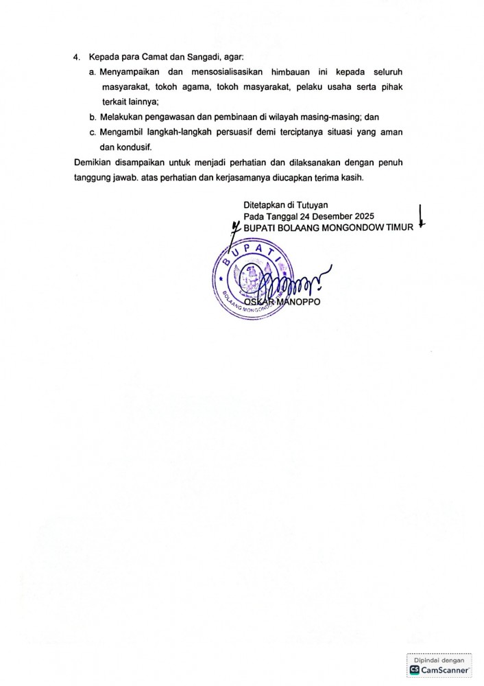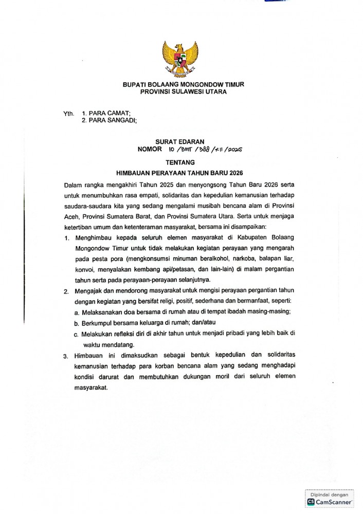SURAT EDARAN BUPATI BOLAANG MONGONDOW TIMUR TENTANG HIMBAUAN PERAYAAN TAHUN BARU 2026