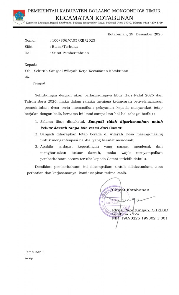 Sehubungan dengan akan berlangsungnya libur Hari Natal 2025 dan Tahun Baru 2026 serta dalam rangka menjaga kelancaran penyelenggaraan pemerintahan desa dan memastikan pelayanan kepada masyarakat berjalan optimal, bersama ini disampaikan kepada seluruh Sangadi se-Kecamatan Kotabunan hal-hal sebagai berikut: